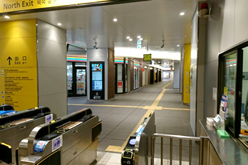 北口改札を出て直進すると、勾玉デザインの出口に出ます。正面の大きな通りが長堀通りです。