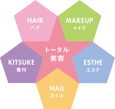 本校ではヘア・まつ毛エクステンション・メイク・ネイル・エステ・着付の美容スキルを学ぶことができ、幅広く活躍できる美容師を目指せます。