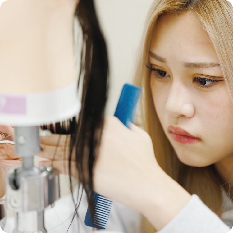 美容師は専門的な技術と知識が必要とされる「技術職」です。お客様に満足していただけるようなスキルを磨く必要があり、仕事を始めてからも常に技術のレベルアップのために、勉強やトレーニングを積むことが求められます。本校では在学中から美容師としての技術と意識を高めるため、「基礎」と「実践」を積み重ねて確かな実力を身につけます。また、まつ毛エクステンションやネイル、メイク、エステ、着付などの「トータル美容」を学習できる独自のカリキュラムで、「美容のプロフェッショナル」になるまでの道のりをサポートします。