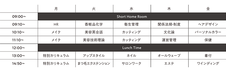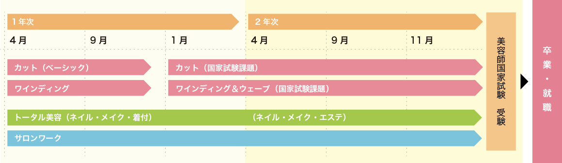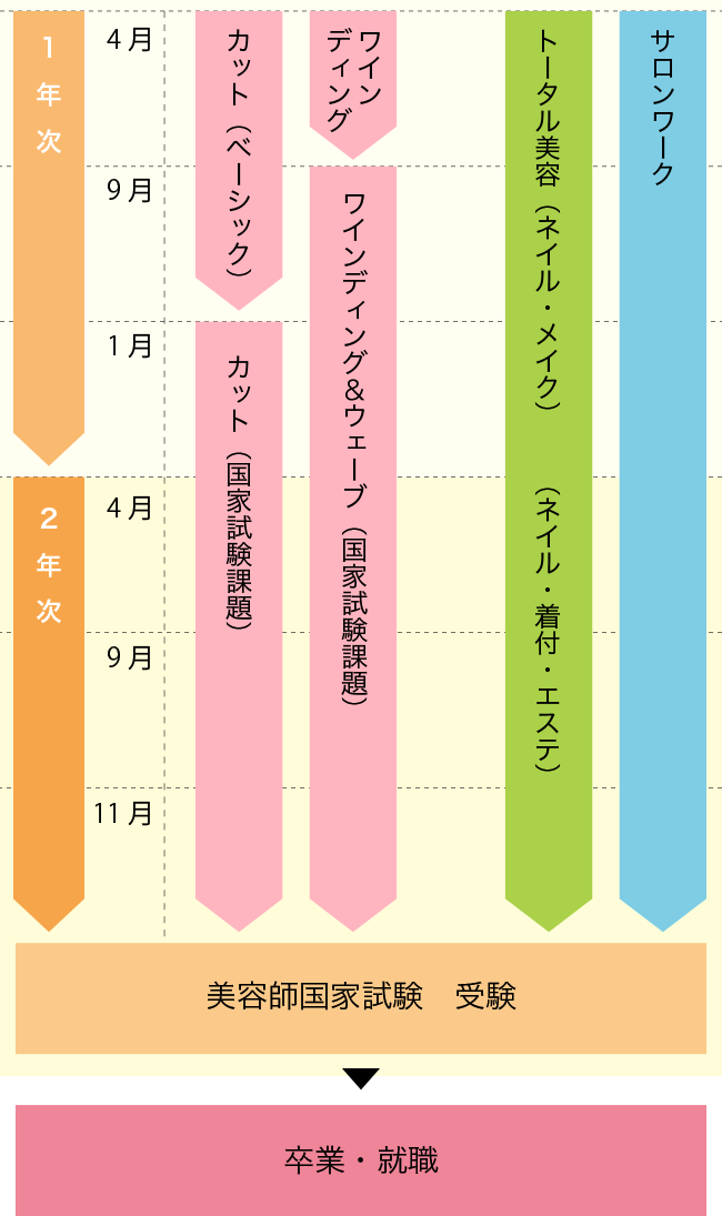 2年間でトータル美容を習得。ヘアを中心に、まつ毛エクステンション、メイク、ネイル、エステ、着付まで。人を美しくするあらゆるスキルを2年間で学び、自分に合った道を見つけられます。